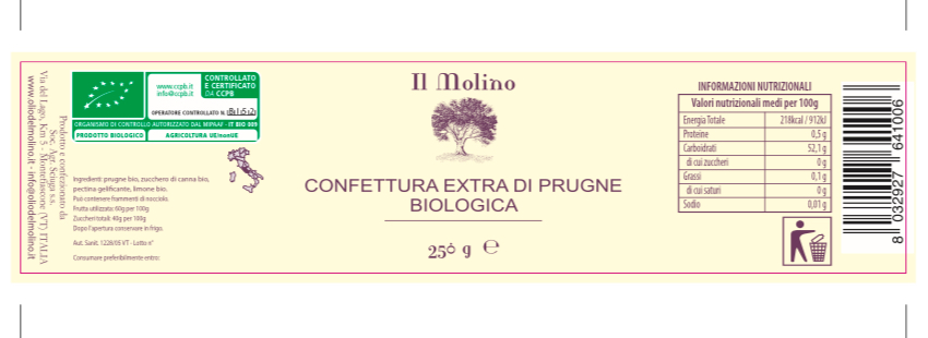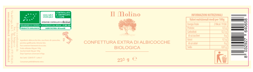 frutta bio prodotta in azienda (58,8%), zucchero di canna bio (40%), pectina